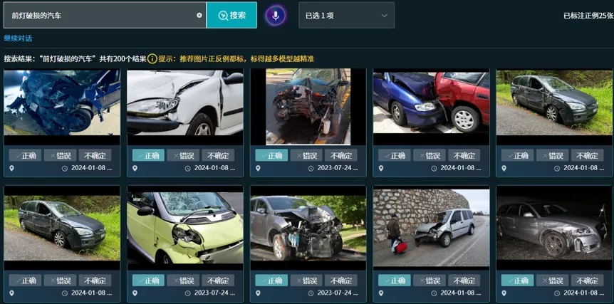 (上圖示例:“前燈破損的汽車”,系統(tǒng)不僅能理解抽象的描述,還迅速反饋出精確的圖像結(jié)果)