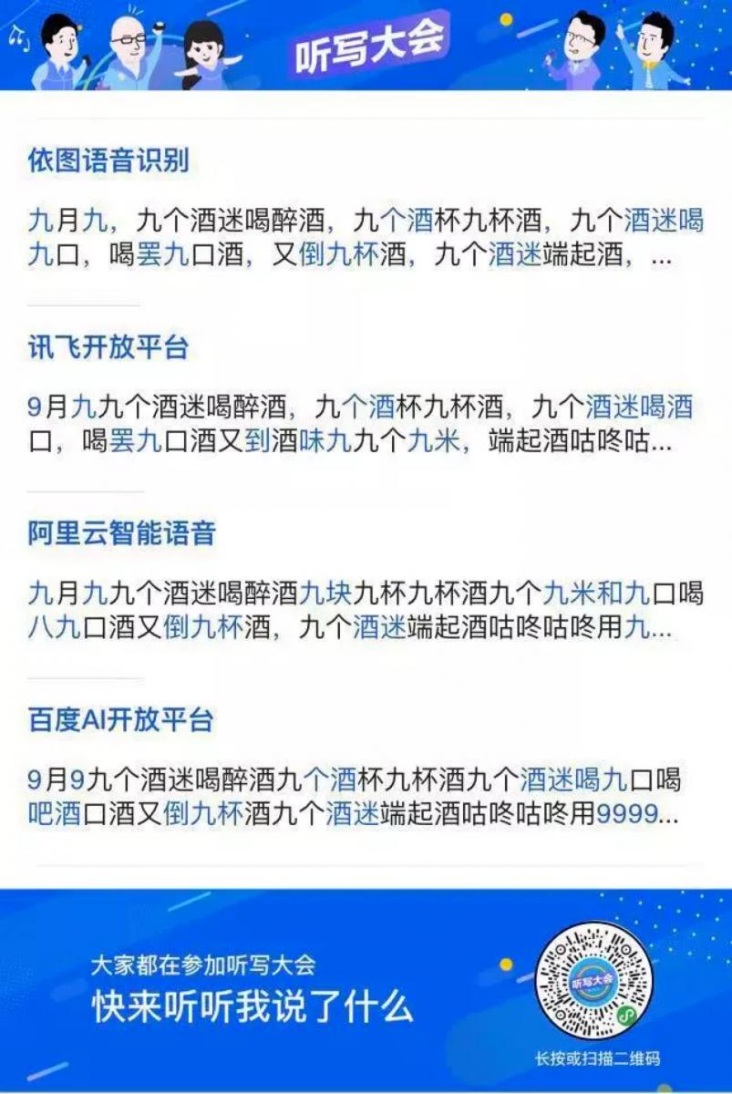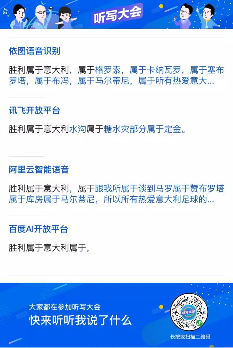 聽寫大會小程序一經發布,各種評(tiao)測(xi)洶涌而來。依圖語音憑借自身優秀的技術,展現了極其穩定的語音識別能力。