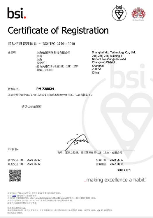To date, YITU has obtained a number of authoritative international standards certifications for information security and privacy protection, including ISO/IEC 27701:2019 and ISO/IEC 27001:2013. ISO/IEC 27701:2019 is the world's strictest, widely accepted international certification for privacy information management systems (PIMS) that meet best practices outlined in regulations such as the General Data Protection Regulation (GPDR).